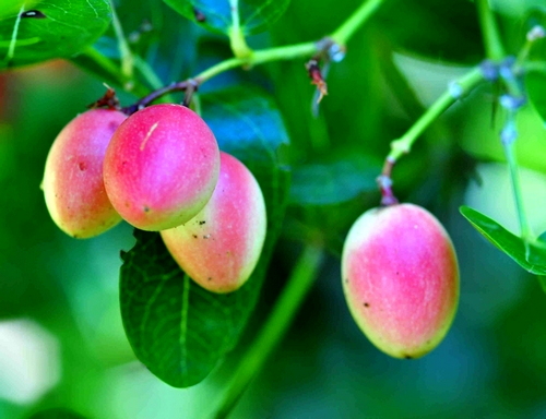 刺黄果(Carissa carandas L.)是夹竹桃科假虎刺属,为常绿灌木,株高可达4-5米,多分枝,有刺。叶对生,革质,暗绿色,有光泽,先端微突,叶基有分叉的刺。花为顶生或腋生聚伞花序,花萼五深裂,裂片基部内面有时具离生腺体,花冠高脚碟形,端五裂,白色或淡红色,有香气。浆果光滑,长卵形似枣,直径1-2厘米,初为绿色,后为白色,再后为红色,有淡雅的香味。
