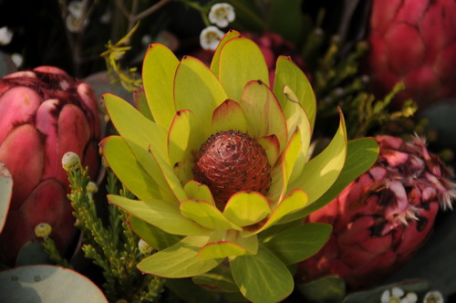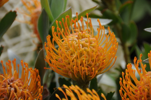 帝王花植株寿命达百年以上,是山龙眼科(Proteaceae)的代表植物之一。山龙眼科植物在地球上存在的历史悠久,可追溯到300万年前。此次花展共展出各种帝王花属、针垫花属和木百合属植物品种多达36种,总量达6000株,全部从南非空运而来。除了前几届曾展出的帝王、白雪皇后、芭芭拉皇后等品种外,还有首次和大家见面的克莱尔、红宝石等品种,极具异域风情。而绚丽夺目的针垫花属(Leucospermum)植物——金粉、金樽等,俏丽耐看的木百合属(Leucadendron)植物——金冠、圆玫瑰等,飘洒俊逸的珊瑚草、咖啡芦竹等观叶植物,也各有各精彩,绝对不容错过。