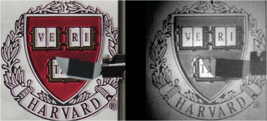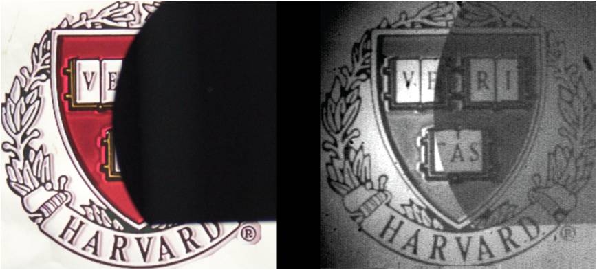 图3 飞秒激光制作的黑硅,可见光成像(左)和红外成像(右)