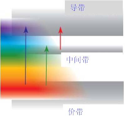 现代太阳能电池从1954年开始,到今天已经有60周年了,那时候的材料就是我的硅姐妹。今天她已做成了世界上最广泛使用的电池类型,工厂里面不停地生产,为人类提供了大量的电力,造福了全人类。而我还在黑暗中摸索,虽然很多人因为我的黑对我情有独钟,不断的探索我的特性。但是,世间万物需要平衡中实现最优化,虽然表面微纳米结构和硫掺杂给了我全黑的秉性,我能够把所有的太阳光留住,但是现在却很难把光导出形成可利用的电力,因为激光造成的微纳米非晶态缺陷,也给我引入了更多的电子复合损耗,就像路上车太多、障碍太多堵住了一样,很难通畅。目前,利用我吸收的大于1.1微米波段的红外太阳光形成的电量几乎探测不到,而对小于1.1微米的光生载流子也产生不了效果。为了很好的实现顺畅的通路,人们设想了一些路径,其中有条路叫做中间带(如图5的中间带能级图),通过保持住常规的上下能级位置,并实现在中间插入一个新的能带,就像新建悬空的高架桥一样,这样我也许就能很好地被利用来产生电力了。可是现在大家还没有造好这座桥。