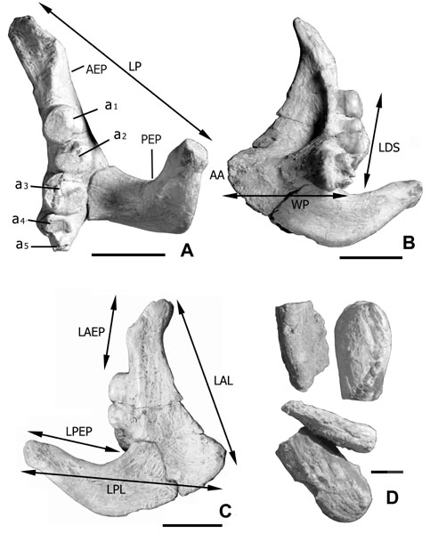 图1 伍氏青鱼咽齿和咽骨化石(A 背视、B 内侧视、C 外侧视)及伴生腹足类化石(D)