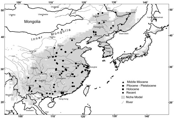 图2 伍氏青鱼化石分布点(三角形)和青鱼生态位模型(灰度阴影区)