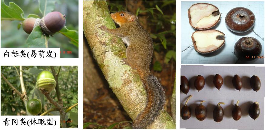 松鼠是一类非常聪明和可爱的动物,其存活和繁殖依赖橡子和其它种子等作为食物资源。栎类中,白栎类(subgenus Quercus)橡子在成熟后即可迅速萌发,而北美的红栎类(subgenus Erythrobalanus)和亚洲的青冈类(subgenus Cyclobalanopsis)等的橡子则常到次年春季后才萌发。对贮藏种子的动物而言,种子的迅速萌发将造成能量和营养的损失,因而非休眠性种子不利于被长期贮藏。近年来,研究人员在我国相继发现至少有3种松鼠表现为对非休眠性白栎类橡子的切胚行为,即四川都江堰地区发现赤腹松鼠(Behavioral Ecology, 2009)、在陕西佛坪秦岭地区发现岩松鼠(Behavioral Ecology, 2010)和在云南哀牢山发现红颊长吻松鼠(Animal Behaviour, 2012)。结合北美地区多种松鼠亦具有切除橡子胚芽行为,这些发现为洲际间动物行为的趋同进化和适应提供了有力的证据。研究表明松鼠对非休眠性白栎类橡子切胚行为的适应性表现在以下方面:
