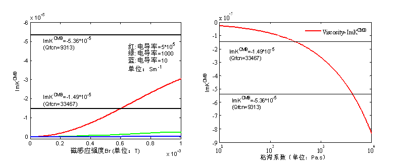 图 3 耦合常数虚部与核幔边界相关参数的关系(左:电磁耦合;右:粘滞耦合)