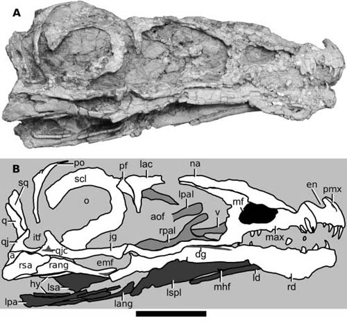 图1 赵氏敖闰龙头骨和下颌骨标本(IVPP V15709)右侧视图,比例尺为1厘米(图片来源JSP)