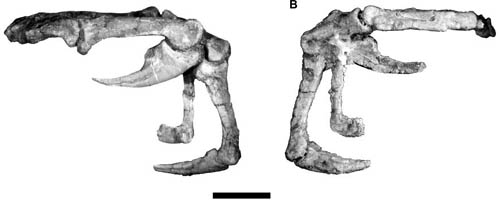图2 赵氏敖闰龙前掌化石标本(A中视,B侧视),比例尺为1厘米(图片来源JSP)