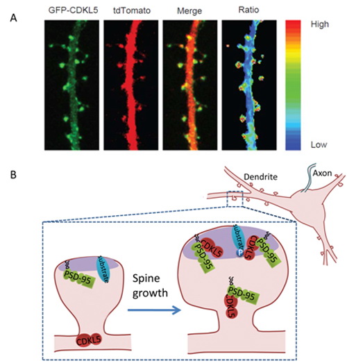 A.GFP标记的CDKL5蛋白在培养的海马神经元上富集于树突棘。B.模式图显示棕榈酰化的PSD-95招募CDKL5进入树突棘,从而促进突触的生长和成熟。