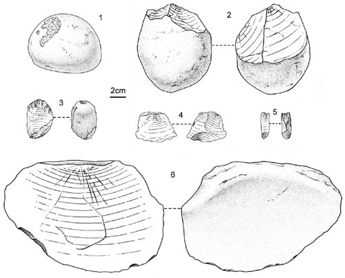 图1 果茶场II遗址出土的石锤(1)、石核(2,3)和石片(4-6)(许勇绘制)