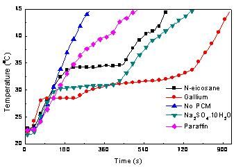 总的说来,借助如冰蓄冷一般的金属相变材料的交替性蓄冷-熔化过程,可以达到灵巧的冷却目的,这种无需额外设置专用冷却系统的热管理方式,特别适合于手机等移动电子设备。以往,尽管学术界也曾尝试采用相变方法来冷却手机,但因受限于既定材料的物性而制约了实际应用。比如,传统有机类相变材料如石蜡、烷烃、醇类以及脂肪酸等虽然性能稳定、过冷度小、成本低,但热导率小、热响应慢,相变时体积变化率较大从而会使系统体积显著增加;而无机类相变材料如结晶水和盐、熔融盐等,虽价格便宜,储热密度大,但过冷度高,熔化之后会因无机盐与结晶水之间的密度差而造成相分离,同时还会因结晶水蒸发引起再凝固继而产生低水化合物,最终使得相变材料的长期工作稳定性变差。高熔点金属作为相变材料虽有提出,但因在常温下无相变行为,无法用于电子设备热管理。综合而言,常温附近即可熔化的金属及其合金材料则体现出诸多诱人的优势:1.热导率高,是传统相变材料的数十甚至上百倍,这有利于吸热系统的快速响应,同时也减小了热源与环境之间的热阻;2.金属材料稳定性好,在相变过程中不会出现相分离、相分层现象,经无数次熔化凝固之后依然表现出完好的相变特性;3.低熔点金属密度大、单位体积相变潜热高,且相变过程中体积变化率小,远低于传统材料,这有利于实现高度紧凑的热管理系统。
