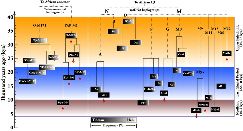图-1.藏族人群中Y-染色体和mtDNA主要单倍型的共祖时间。箭头标示的为藏族特有或以藏族为主的单倍型。