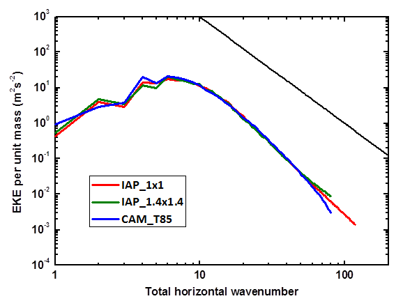 250hPa涡动动能谱分布:红线,IAP模式(分辨率1o x 1o);绿线,IAP模式(分辨率1.4o x 1.4o);蓝线,CAM模式(分辨率T85)