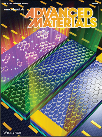 前期工作中,有机固体院重点实验室的研究人员发明了氧辅助法,在二氧化硅绝缘材料上直接制备了石墨烯薄膜(J. Am. Chem. Soc.2011, 133, 17548),随后又发现可以通过两段化学气相沉积方法,控制石墨烯的成核点和晶区尺寸,实现了高质量石墨烯薄膜在氮化硅表面上的直接生长。制备的石墨烯薄膜中石墨烯畴晶的尺寸达1μm。薄膜具有高的电学性能,其迁移率在空气中可以达到1510 cm2V-1s-1,在氮气中可以达到1518 cm2V-1s-1。这些性能相比直接生长在二氧化硅基底上的石墨烯薄膜提高了两倍,已经高于部分金属催化石墨烯的性能。该研究成果发表在《先进材料》上(Adv. Mater., 2013, 25,992),并被选为内封面 (图1)。