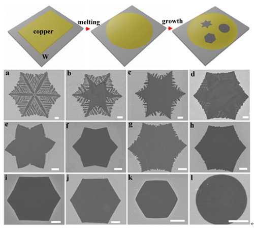单晶石墨烯的形貌调控和刻蚀。实现单晶石墨烯的制备和对其边界结构的调控是石墨烯可控制备研究中广泛认同的前沿课题。后一目标尤其面临着缺乏理论指导和具体解决方案的双重挑战。化学所有机固体实验室的研究人员在前期利用液态铜表面的各向同性CVD法制备正六边形单晶石墨烯的基础上(Proc. Natl. Acad. Sci. U. S. A., 2012, 109, 7992),通过对石墨烯成核成长微观动力学过程的调控(Ar和H2比例的连续调控),首次获得了一系列新的热力学上石墨烯亚稳结构(图2)。