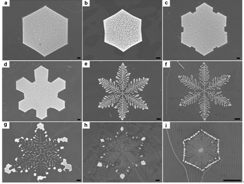 这一系列具有高度六重对称性的石墨烯的形貌遵循着确定的变化规律:石墨烯的边界变化包含了从正曲率到负曲率变化的完整范围。这一石墨烯图案体系与自然界中的雪花结构集合有着惊人的相似,代表了已知材料中唯一完美地以更加简单(雪花为三维晶体)的二维方式再现雪花结构集合的范例。基于以上事实,进一步提出了扩散控制的普遍生长机制,并与理论模拟相吻合。这一工作首次将石墨烯的生长和形貌调控与非平衡体系下动力学上的调控联系起来,揭示了石墨烯生长中的一个从未被发现但普遍存在的基本规律,原理上可推广到更广泛的二维原子晶体材料。相关工作发表在自然出版社集团旗下的《亚洲材料》(NPG Asia Mater.,2013, 5, e36)上。