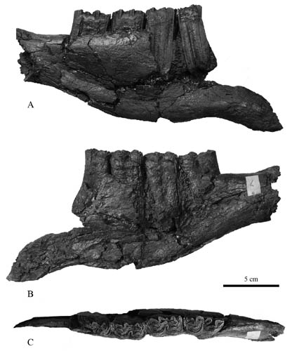 图1 西氏三趾马残破右下颌(IVPP V 18497.1),A舌侧视,B唇侧视,C冠面视。(孙博阳供图)