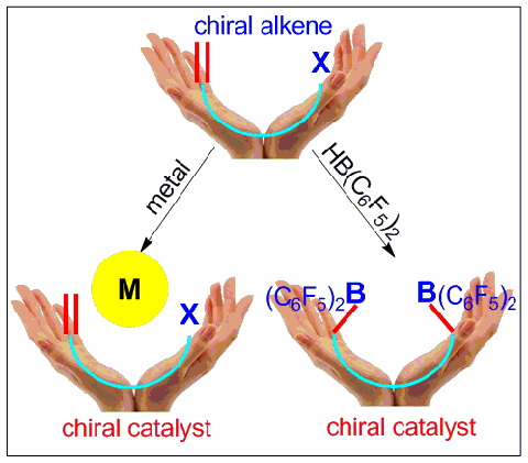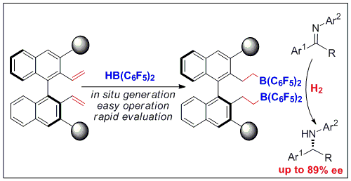 Frustrated Lewis Pairs(FLPs)是2006年以来新兴的热点研究领域,由于可以实现氢气的活化,为非金属催化氢化反应提供了重要新途径,但是高对映选择性的不对称氢化反应十分具有挑战性。最近,研究人员基于手性烯烃作为“配体”的新策略,通过烯烃的转化(图1),快速制备了新型手性FLP催化剂,顺利实现了非金属催化亚胺的不对称氢化反应,对映选择性最高可达89%(图2)。这是目前FLP催化剂在不对称催化领域所取得的最好结果,同时也为新型、高效手性FLP催化剂的设计提供了新的思路(J. Am. Chem. Soc. 2013, 135, 6810-6813)。