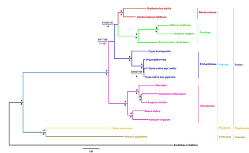 竹亚科、稻亚科和早熟禾亚科的系统发育关系图(PAUP, RAxML, MrBayes 和MP-EST 用来推断了系统关系。水平线上方和下方分别代表基于蛋白质和核酸序列推断出的支持率。)“*”代表支持率为PP=1.0或者BP=100。“#”代表所有支持全为1.0和100. 基于蛋白质超矩阵,MrBayes估计了各分支的长度。