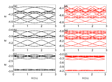 图1:填充数等于1/3的系统的谱流图(在扭曲边界条件下能量随扭曲边界相角的变化)。 (a)-(c)展示了N=2的系统, V别的等于1,50,500的情况。(d)-(f)展示了N=3的系统,V分别等于1,50,500的情况。当相互作用很强时,可见形成三度简并的基态空间,并有一个明显的能隙同激发态分开。