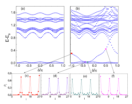 图2:系统的低能能谱随着调制势相位\delta的变化,这里E0代表系统的基态能量。(a)对应于周期边界条件;(b)对应于开边界条件; (c)-(f)是能隙中的模式的密度分布,对应于不同的调制势相位。对比周期边界条件下的能谱,可见随着调制势相位\delta的变化,开边界条件下的能谱在能隙内部区域出现了连接基态和高激发支的边界模式。