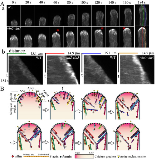 Villin调控花粉管顶端微丝细胞骨架动态变化(A)微丝在突变体花粉管的顶端和顶端侧翼区域累积。(a)花粉管生长中顶端微丝的动态变化;(b)a图对应颜色轨迹上的微丝的动态变化。(B)villin介导的花粉管内微丝动态调控作用模型。
