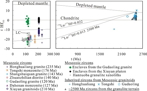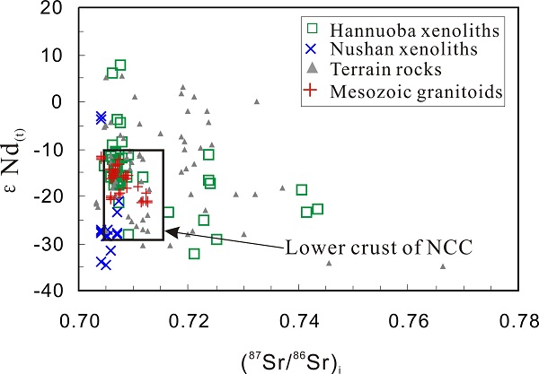 中科院地质与地球物理研究所岩石圈演化研究室的姜能研究员等人通过多年来对汉诺坝麻粒岩包体系统详细的研究,并与华北克拉通其它地区产在不同时期火山岩中的麻粒岩包体进行对比,发现麻粒岩包体与地表出露的麻粒岩地体在Sr-Nd-Hf同位素方面非常相似,在时代上都主要为晚太古代。另外,在华北克拉通东部分布有大量的中生代花岗岩,研究显示它们主要来源于晚太古代下地壳的部分熔融。因此,综合麻粒岩地体、麻粒岩包体和中生代花岗岩三者的研究资料,他们对华北克拉通东部下地壳的性质进行了限定:(1)在时代上主要是在晚太古代形成的;(2)在成分上主要为SiO2<62%的中-基性岩石;(3)推荐的下地壳Sr-Nd-Hf同位素组成:计算到130 Ma时(87Sr/86Sr)i, εNd (t)和εHf (t)分别为0.705 ~ 0.716, −10 ~ −28和−13 ~ −28(图1)。他们认为把麻粒岩地体、麻粒岩包体和花岗岩三者相结合得出的对华北克拉通东部下地壳性质的认识无疑比单一途径获得的信息更令人信服。