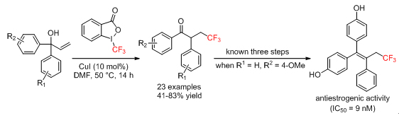 中科院广州生物医药与健康研究院吴筱星课题组与西安交通大学李鹏飞课题组合作,成功地实现了对a,a-二芳基烯丙醇的铜催化三氟甲基化诱导的1,2-芳基迁移反应。并通过对不对称底物反应的研究,阐明了该类反应是通过三氟甲基自由基的机理进行的,从而为设计新型三氟甲基化反应提供了重要的依据。此外,通过该方法能合成一系列其它途径难以获得的b-三氟甲基芳基酮化合物,并可用于制备具有显著抗雌激素活性的化合物。