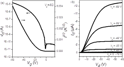 图3. 1,7-位烷基取代PXX衍生物的晶体管性能曲线:(a)转移曲线(b)输出曲线 |