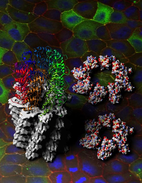 图一:显示Par-3的N端结构域的螺旋组装结构和其基本的通过静电相互作用首位相接的组装形式,背景显示的是Par-3介导的细胞极化现象。