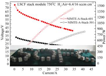 通过上述研究,宁波材料所研发的电池堆于2011年开始面向全球全面销售,2012年销售额突破百万,成为固体氧化物燃料电池领域中国首个明码标价的SOFC电池堆供应商(www.sofc.com.cn),并因此获得了宁波材料所2012年度的最佳技术奖。通过两年来销售的带动,宁波材料所在SOFC电池堆领域取得了全面提升。宁波材料所研发的NIMTE-A-Stack-301标准30单元电堆在运行温度750℃下,运行功率≥750W@(0.75V,F≥60%),衰减速率≤2%/1000h,运行条件下体积功率密度≥1000W/L。NIMTE-A-Stack-601为标准60单元电池堆,在运行温度750℃下,运行功率≥1500W@(0.75V,F≥60%),衰减速率≤2%/1000h,体积功率密度同样≥1000W/L。