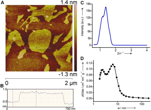 图1(A和B)石墨烯的原子力照片;(C)小角X-射线衍射图;(D)孔径分布图