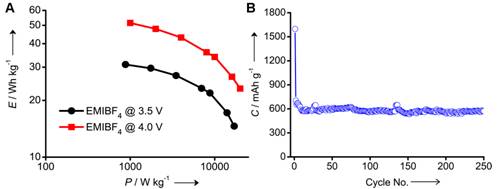 图2(A)石墨烯基对称型超级电容器在离子液体电解液下的能量密度和功率密度关系曲线;(B)石墨烯作为锂离子电池负极材料的循环寿命