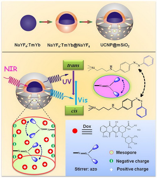 在基于UCNPs的肿瘤多模式影像诊断的基础上,他们又系统研究了多种基于UCNPs的多功能诊疗剂在肿瘤化疗、放疗及多模式联合协同治疗上的应用。考虑到很多抗癌药物通过破坏核内DNA的作用机制,他们设计并成功制备了兼具宫颈癌高效细胞核直接给药和细胞核实时UCL/MRI双模式成像的超小尺寸(~35 nm)多功能纳米诊疗剂;与传统纳米诊疗体系细胞质输运相比,这种新型纳米诊疗体系可以将破坏DNA结构的抗癌药物直接输送至细胞核中的靶点周围,显著提高了药物的利用度及疗效(Biomaterials 2012, 33, 7282-7290)。在此基础上,为了使化疗药物可控释放,并降低其在生物体内的毒副作用,他们设计和制备了具有核壳结构的多功能纳米诊疗剂(NaYF4:Yb/Tm@NaYF4@mSiO2),借助于近红外光(980nm)激发下UCNPs发出的紫外/可见光,使介孔孔道内光敏剂偶氮苯发生连续的旋转-翻转运动,从而实现了对生物组织具有高穿透深度的近红外光照下的可控药物释放,避免了传统紫外光对生物组织的毒副作用(Angew. Chem. Int. Ed.2013, 52, 4375-4379)。