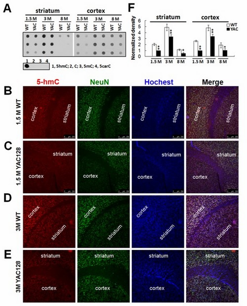 亨廷顿氏舞蹈病是一种常染色体显性遗传的神经退行性疾病,其主要病理特征是大脑纹状体神经元的渐进性死亡。亨廷顿基因突变导致纹状体神经元选择性死亡的机制还不清楚,目前也没有任何治疗手段。DNA胞嘧啶的甲基化修饰是一重要的表观修饰方式,在染色体结构重塑、基因沉默、发育与分化等过程中扮演着关键角色。最近有研究结果证实,胞嘧啶的甲基化可被进一步氧化为羟甲基化修饰,有证据显示胞嘧啶羟甲基化修饰(5hmC)在胚胎发育和胚胎干细胞的增殖分化、神经细胞的分化成熟中有重要作用。关于DNA的5hmC修饰与神经退行性疾病的关系还未见报道。