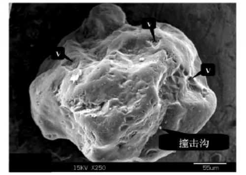 海滩沙电镜扫描照片。呈次棱角状,边缘受磨损、圆化,V形坑和撞击沟是水下环境的标志