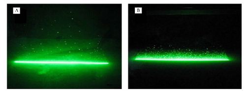 在高湿度(A,M=2.713%)和低湿度(B,M=0.143%)状态、风速为12m·s-1时PIV测试照片 |