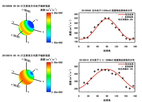 天宫一号带电粒子辐射探测器实测高能电子和质子方向分布;左侧的彩色球体表示天宫一号在南大西洋异常区中心不同方向上的电子和质子的辐射强度,右侧图表示在南大西洋异常区中心电子和质子通量随投掷角的分布。