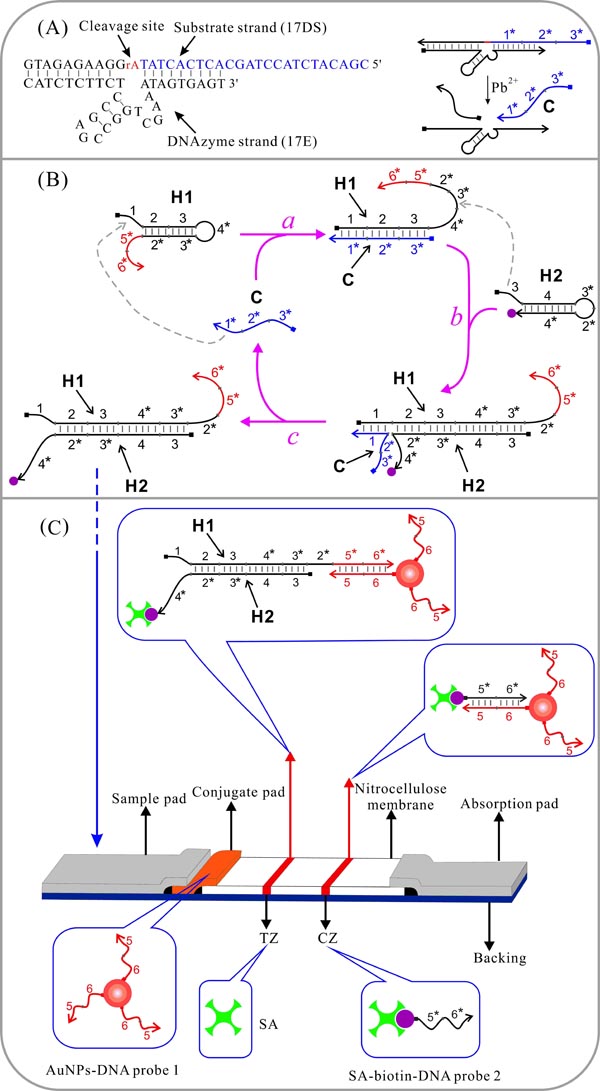 铅离子是一类主要的环境污染源,对人体健康以及生态环境具有极大的危害和致癌性。传统的检测方法主要是一些色谱、质谱技术,但操作麻烦,需要昂贵的仪器,因而限制了它们的广泛应用。中科院广州生物医药与健康研究院曾令文研究组以铅离子特异性的DNAzyme为分子识别元件,构建了一种非酶信号扩增试纸条用于铅离子的超灵敏检测。当有铅离子存在时,切割的DNAzyme的底物链会启动一系列的DNA自组装过程,从而达到信号放大的目的。