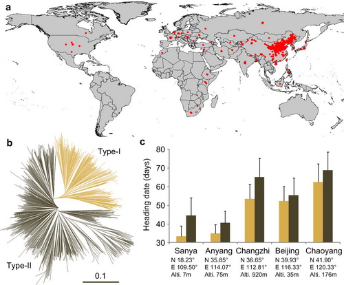 研究者利用在水稻基因组学研究中开发的技术和分析方法,对916份谷子品种(包括农家品种和育成品种)开展了全基因组低倍重测序和序列分析,构建出一张精细的谷子单倍体型图谱。该研究在5个不同纬度环境下(朝阳、北京、长治、安阳、三亚)考察了这些谷子品种的株型、产量、花期、抗病性等47个农艺性状,并采用全基因组关联分析方法鉴定到了512个控制这些性状的遗传位点。