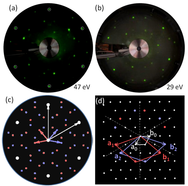 图1. Ir(111)表面硅层结构的LEED图像和相应的示意图,表明LEED图像显示的是相对于基底Ir(111)的硅层(√7×√7)超结构。(a)虚线标示的六个衍射点来源于基底Ir(111)的六重对称性。其他的衍射点来源于硅层结构。(b)在更低入射电子能量下得到的LEED图像。(c)Ir(111)表面(√7×√7)超结构的理想LEED图像,和(a)图一致。每组衍射点由白色,红色和蓝色箭头标示。(d)衍射点对应的实空间结构示意图, 基底Ir(111)基矢为(a0,b0),硅层(√7×√7)超结构基矢为(a1,b1)或(a2,b2)。