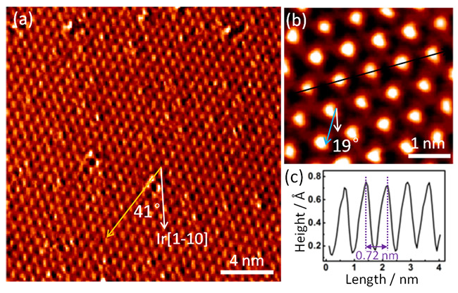 图2. (a)Ir(111)表面生长的硅层(√7×√7)超结构的STM图像(U = -1.45 V, I = 0.25 nA),超结构方向由黄色箭头表示,基底Ir[1-10]方向由白色箭头表示,两个方向之间的夹角是41o。(b)硅层(√7×√7)超结构第二种取向的STM图像(U = -1.5 V, I = 0.05 nA),方向由蓝色箭头表示。它和基底Ir[1-10]方向的夹角是19 o。(c)(b)图中沿黑色直线所示的剖面线,显示硅层超结构的周期约为0.72 nm,起伏约为0.6 Å。