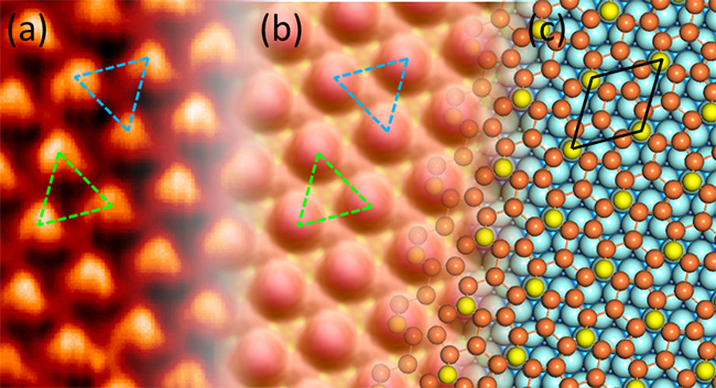 图3. (a)硅层结构的放大STM图像。除了最亮的突起之外,还有另外两个具有不同起伏对比度的区域,分别蓝色和绿色三角表示。(b)模拟的STM图像,显示的特征和实验结果一样,用同样的三角和六角表示。(c)在(√7×√7)铱的基底上生长的硅烯的弛豫原子模型,铱(√7×√7) 超格子刚好对应于硅烯的(√3×√3) 格子, 如平行四边形所示。