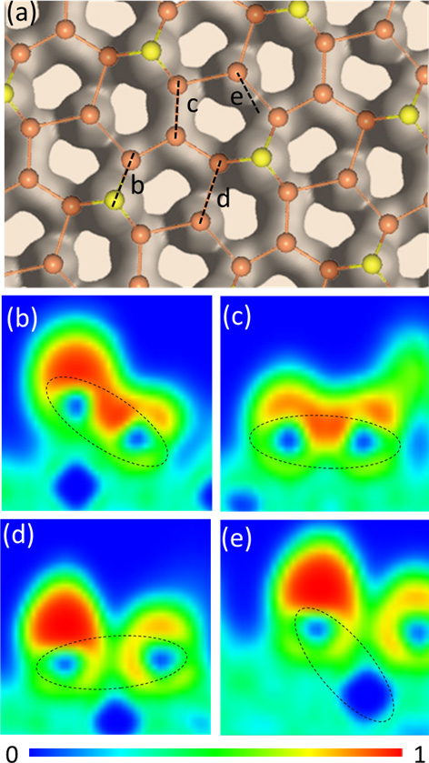 图4. (a)弛豫原子模型的整体电子局域化函数的顶视图(ELF值0.6)显示了硅烯的连续性。(b-d)不同位置硅原子对(椭圆形虚线)截面的电子局域化函数,显示了在每对硅原子之间都存在共价相互作用。(e)硅原子和离它最近的铱原子之间的截面的电子局域化函数。ELF值在0.38附近,表明原子之间存在的是静电的相互作用。 |