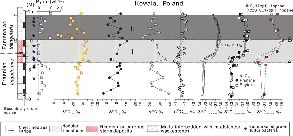 为了更好地了解晚泥盆世F-F转折期的古海洋演化,中科院地质与地球物理研究所油气资源研究室的陈代钊研究员及其合作者分别以位于古特提斯洋东部和西部的中国南方付合剖面和波兰圣十字山Kowala剖面的F-F界线剖面为研究对象,进行了高分辨率的碳酸盐岩CAS和黄铁矿硫同位素研究(δ34SCAS和δ34SPY)。研究结果表明:F-F转折期的海洋演化可以分为两个阶段。以付和剖面为例(图1),阶段一:为晚弗拉斯期的海平面下降阶段,以钙质浊积岩与风暴岩沉积为主。在该段底部,δ34SCAS和Δ34S呈现明显的正漂,向上逐渐回落至基准值,Δ34S表现得尤为明显;阶段二:为早法门期的海平面上升阶段,以瘤状灰岩沉积为主。δ34SCAS和δ34SPY同时出现负漂,并持续至该阶段结束,期间Δ34S保持低值;紧接着,δ34SCAS和δ34SPY出现快速的正漂,但δ34SCAS增幅相对较小,并向上降低,从而导致Δ34S明显降低,甚至变为负值。Kowala剖面的δ34SCAS、δ34SPY和Δ34S的演化趋势基本与付合剖面相一致(图2)。两个剖面的数据均表明在F-F转折期存在着δ34SCAS和δ34SPY的大幅波动。