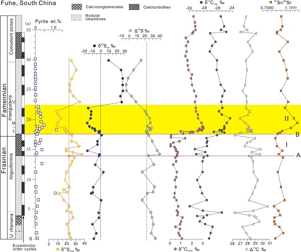 该研究成果近期发表在国际地学刊物Journal of the Geological Society上(Chen et al. Large sulphur isotopic perturbations and oceanic changes during the Frasnian-Famennian transition of the Late Devonian. Journal of the Geological Society, 2013, 170: 465-476)。