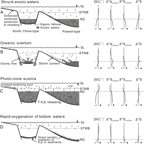 在新的生物地层资料基础之上,结合早期同剖面样品的有机碳同位素、无机碳同位素和Sr同位素研究成果,研究人员认为,在弗拉斯阶末裂谷内断块掀斜引起海平面的快速下降会强化浊流(陡坡)或风暴流(缓坡)作用,导致海洋底水的翻转(图3),使得底层缺氧、富34S、硫酸盐亏损的海水上升到海洋表面,底水得到更新(补充),从而导致该阶段沉积物中δ34SCAS和Δ34S具有相似的变化趋势。在海平面快速上升的早法门期,温暖潮湿的气候使陆源营养物质的输入增加,从而导致初级生产力和有机质埋藏的速率增加,强化了BSR作用,同时产生大量H2S气体。当海水中的Fe被消耗殆尽,过量的H2S就会扩散到表层海水中,造成透光带海水的硫化。在透光带海水中,轻硫同位素(32S)富集的H2S被直接氧化成硫酸根离子,同时风化作用的增强也会造成沉积物中硫化物的氧化,增加了轻硫同位素硫酸盐的输入,从而导致δ34SCAS和δ34SPY同时负漂并出现低的Δ34S值。在晚triangularis,冈瓦纳冰期开始,气候骤然变冷和/或大规模的海平面下降,改善了海水循环,海水逐渐氧化,使得盆地缺氧、贫硫酸盐的底水大幅收缩,导致底水中δ34SCAS和δ34SPY出现快速的正漂。但底水的完全氧化使得BSR仅在表层沉积物中进行,产生的相对重硫化氢被快速氧化,从而导致Δ34S值逐渐减小,甚至出现负值。