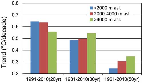 通过利用GTEM模型对1961年—2010年间青藏高原144个气象站观测的年度和月平均气温数据研究表明:过去50年,青藏高原在加速变暖,气候变暖最显著的是冬季,且主要集中于高原西北部和中部。同时,青藏高原气候变暖的速率随海拔增高而增加的特点依旧存在,但总体趋势在逐渐减弱,其中1991年-2010年间,低海拔地区比中高海拔地区升温更迅速,高海拔地区和一些低海拔的山谷是气候变暖最显著的区域。