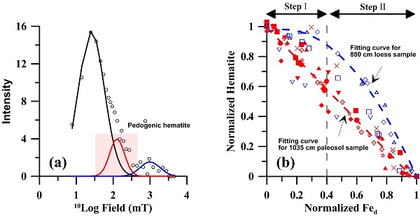 图1(a)典型古土壤样品的矫顽力谱;(b)黄土(蓝色)和古土壤(红色)样品中赤铁矿随铁溶解的溶解行为;在溶解第一阶段,古土壤中大量赤铁矿溶解而黄土中赤铁矿几乎不溶解,这部分易溶赤铁矿与图(a)中低矫顽力、窄分布的组分相对应,代表了成土赤铁矿