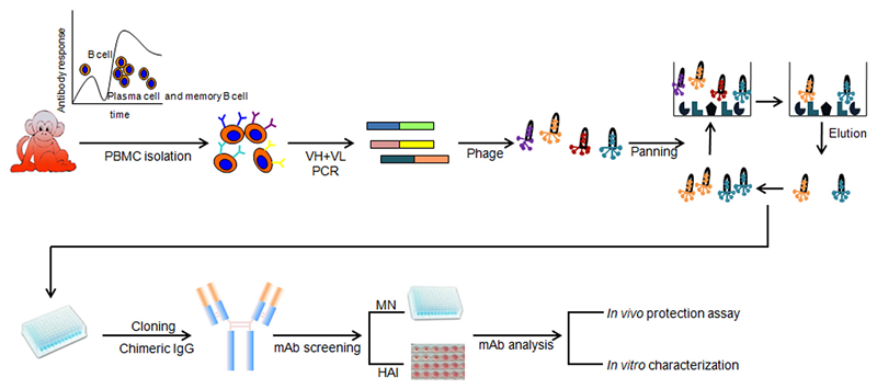 呼吸疾病国家重点实验室陈凌领导的团队联合中国科学院广州生物医药与健康研究院,以及广州医学院广州呼吸病研究所等相关人员,以免疫与人类具有高度亲缘关系的中国猕猴为手段,建立并验证了以免疫猕猴的外周血淋巴细胞为来源,建立抗体噬菌体库,筛选针对病原体的高亲和力中和抗体的平台。利用该平台技术得到的抗体一方面因为免疫细胞经过多次抗原刺激逐步成熟,抗体基因发生高频突变最终使亲和力不断提高,从而能更有效地阻断病原体感染;另一方面,由于猕猴与人抗体基因的高度同源性,而且最终得到的恒河猴抗体可变区与人源抗体恒定区组合为嵌合单克隆抗体后,与人源抗体相似,使其临床应用前景相对其它动物如鼠、兔等来源的抗体更为实际与可靠。在新发突发传染病发生时且无康复者提供免疫细胞用于找寻高效价中和抗体时,使用该策略可迅速找到候选中和抗体用于临床救治。