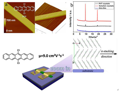 p-型高性能有机半导体材料方面,设计合成并发展了一种高效的、克量级合成6,13-二氯并五苯(DCP)化合物的新方法(J. Mater. Chem. 2012,22, 10496-10500)。该化合物显示了高的空穴迁移率,其最高迁移率达9.0cm2/Vs。研究发现DCP分子在固态中的π-π堆积和大面积的π-π重叠是其呈高性能的原因。与并五苯等有机半导体材料不同,DCP在不同的组装条件下呈相同的晶相,这为构筑高重复性的器件提供了基础(Advanced Materials, 2013, 15, 2229-2233)。