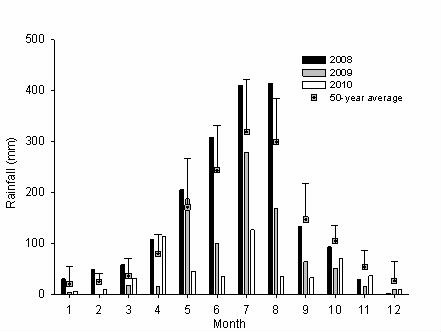 西双版纳2008-2010年降水量与多年平均降水量的比较